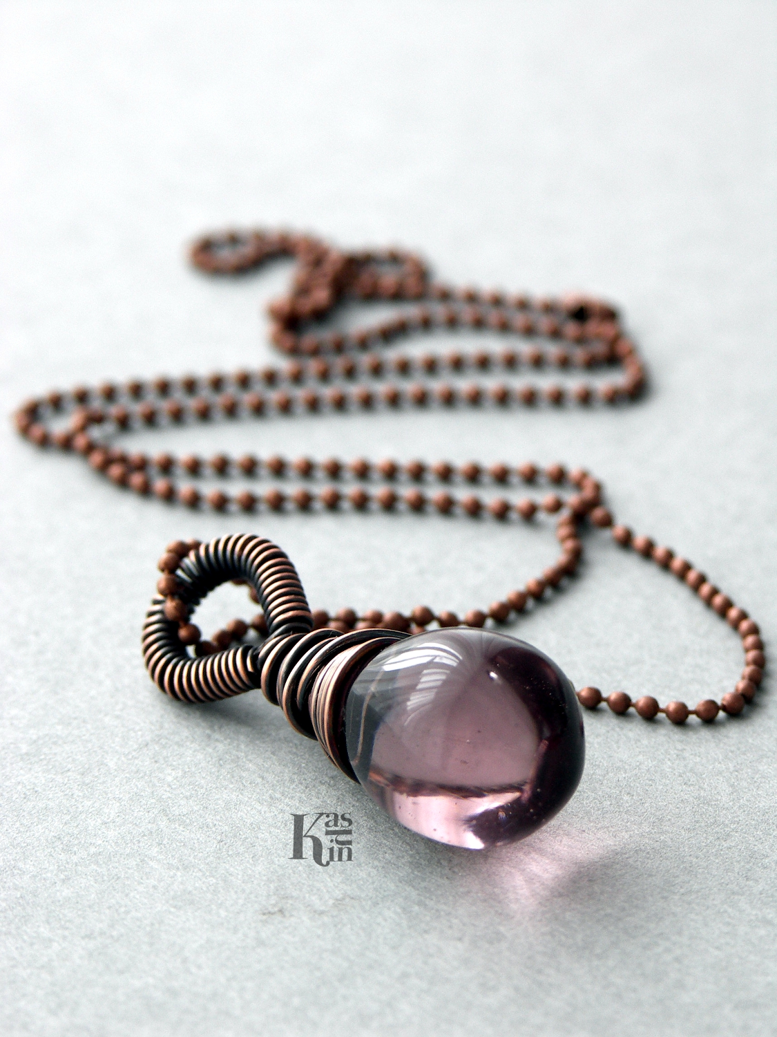 Wisiorek ze szkła oplecionego w miedź. Oksydowany i polerowany. Zawieszony na delikatnym, miedzianym łańcuszku kulkowym.